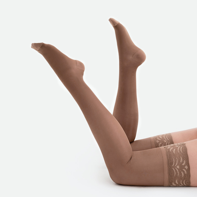 - Широкая резинка с рисунком на ленточном силиконе обеспечивает надежную фиксацию чулок на ноге;