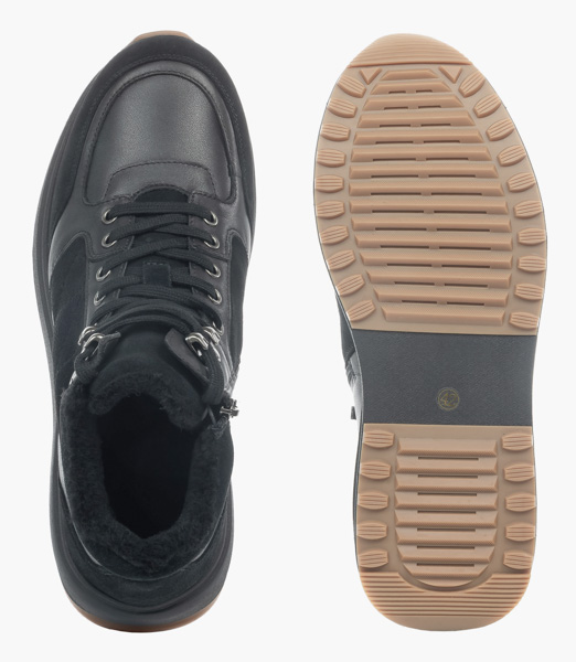 Верх из натуральной кожи черного цвета в сочетании с нубуком , дополненный черной массивной подошвой с каучуковым протектором - образец актуального стиля в сочетании с комфортом. Шерстяная подкладка и покрытие стельки обеспечат ногам тепло при минусовых температурах. Застежка на молнии с внутренней стороны в дополнение к шнуровке  значительно повышает удобство надевания. Анатомическая стелька с выраженной поддержкой сводов способствует распределению нагрузки на ноги и снижению усталости при ходьбе. Голеностоп надежно удерживается от завала плотным задником. Модель достаточно легкая, благодаря подошве из вспененного материала ЭВА, который еще и отлично амортизирует, а противоскользящий протектор обеспечивает устойчивость даже на скользких поверхностях. Подошва имеет перекатный профиль, что значительно снижает усталость при длительной ходьбе и благоприятно влияет на здоровье суставов и позвоночника.